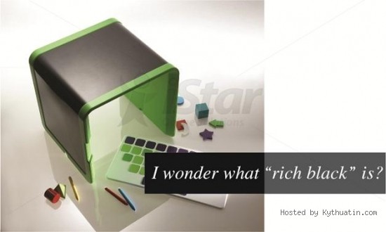 - Rich black (màu đen ngoài 100% đen còn có thêm thành phần một số màu khác như màu Cyan, Magenta): cho các đối tượng màu đen nhỏ, có một phần nằm trên một nền màu sáng, phần kia nằm trên một nền màu tối hơn, thì cách tốt nhất là bạn nên sử dụng màu rich black để tránh sự khác nhau giữa hai vùng màu như hình bên dưới. Thông thường chúng ta sẽ thêm khoảng 40% màu cyan hoặc magenta vào 100% màu đen.
