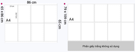 Hình bên dưới trái cho thấy sự sắp xếp được 8 tờ A4 (hay 4 tờ A3,...) vào một trang giấy in khổ 65x86cm.