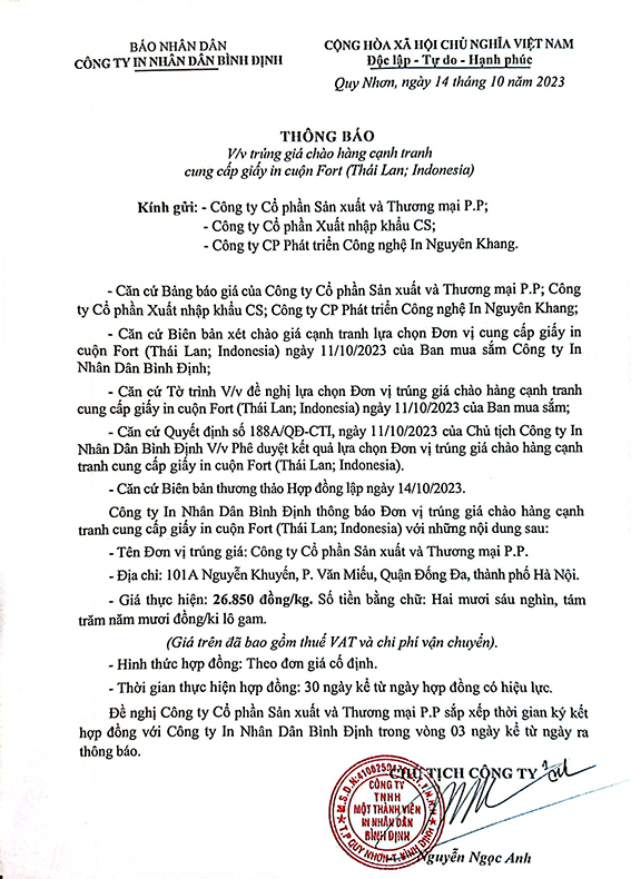 Thông báo đơn vị trúng giá chào hàng cạnh tranh cung cấp giấy in cuộn Fort ngoại (Thái Lan; Indonesia), giấy in báo cuộn Fort ngoại (Thái Lan; Indonesia),....