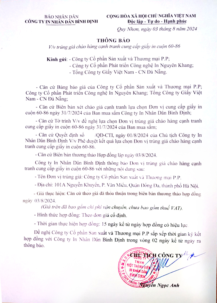 Thông báo đơn vị trúng giá chào hàng cạnh tranh cung cấp giấy in cuộn