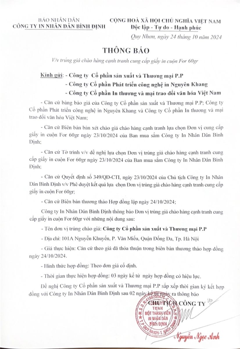 Thông báo đơn vị trúng giá chào hàng cạnh tranh cung cấp giấy in cuộn Fort 60gr