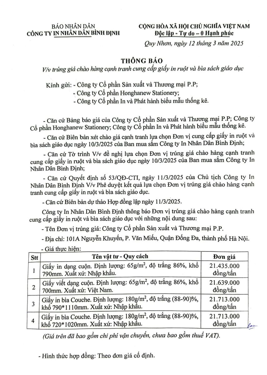 Thông báo đơn vị trúng giá chào hàng cạnh tranh cung cấp giấy in ruột và bìa sách giáo dục