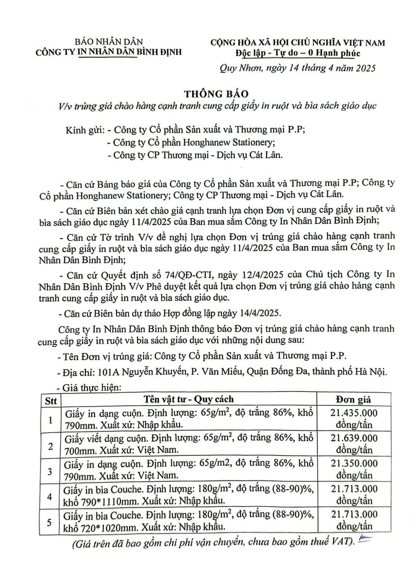 Thông báo đơn vị trúng giá chào hàng cạnh tranh cung cấp giấy in ruột và bìa sách giáo dục 14/4/2025