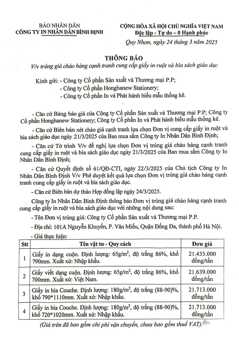 Thông báo đơn vị trúng giá chào hàng cạnh tranh cung cấp giấy in ruột và bìa sách giáo dục 24/3/2025