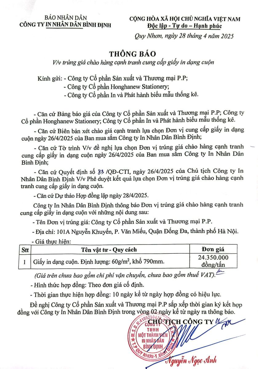 Thông báo đơn vị trúng giá chào hàng cạnh tranh cung cấp giấy in ruột và bìa sách giáo dục 28/4/2025