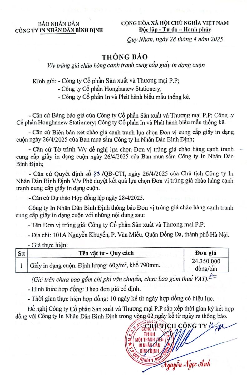Thông báo về việc trúng giá chào hàng cạnh tranh cung cấp giấy in dạng cuộn 28/4/2025