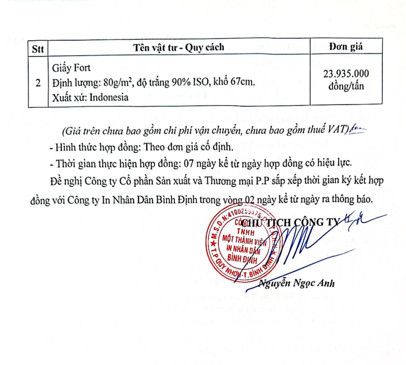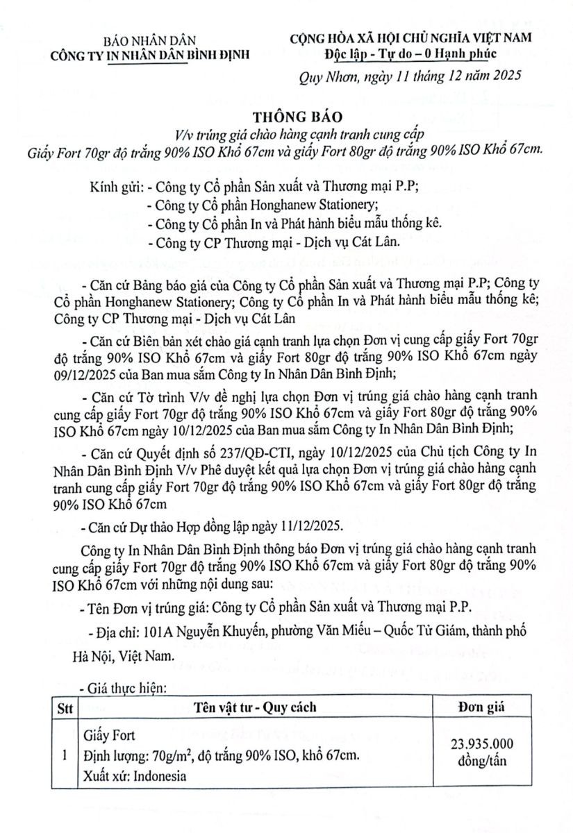 Thông báo V/v trúng giá chào hàng cạnh tranh cung cấp giấy Fort 70gr cuộn ngày 11/12/2025