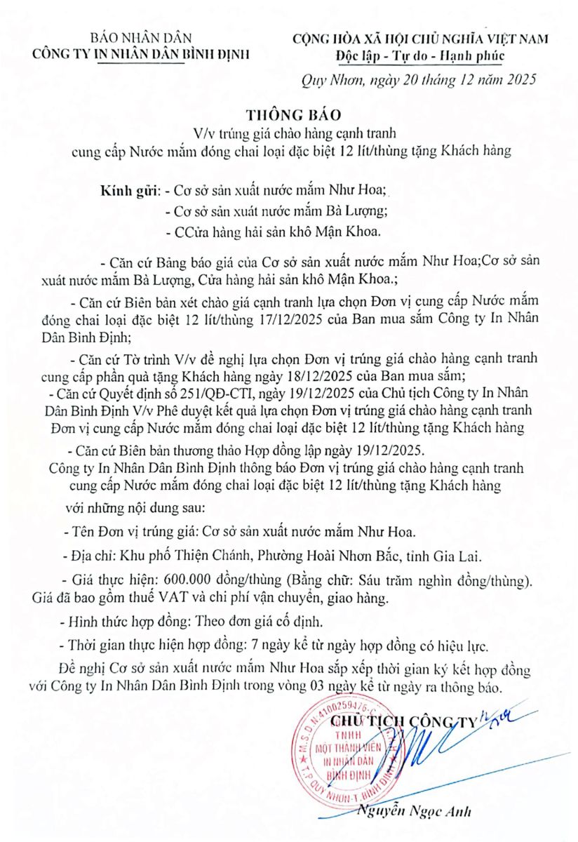 Thông báo V/v trúng giá chào hàng cạnh tranh cung cấp nước mắm đóng chai loại đặc biệt ngày 20/12/2025