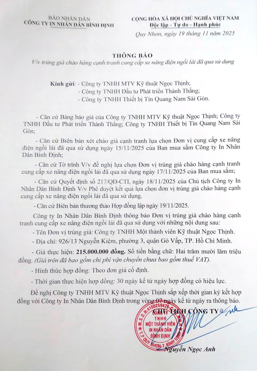Thông báo V/v trúng giá chào hàng cạnh tranh cung cấp xe nâng điện ngồi lái đã qua sử dụng ngày 19/11/2025
