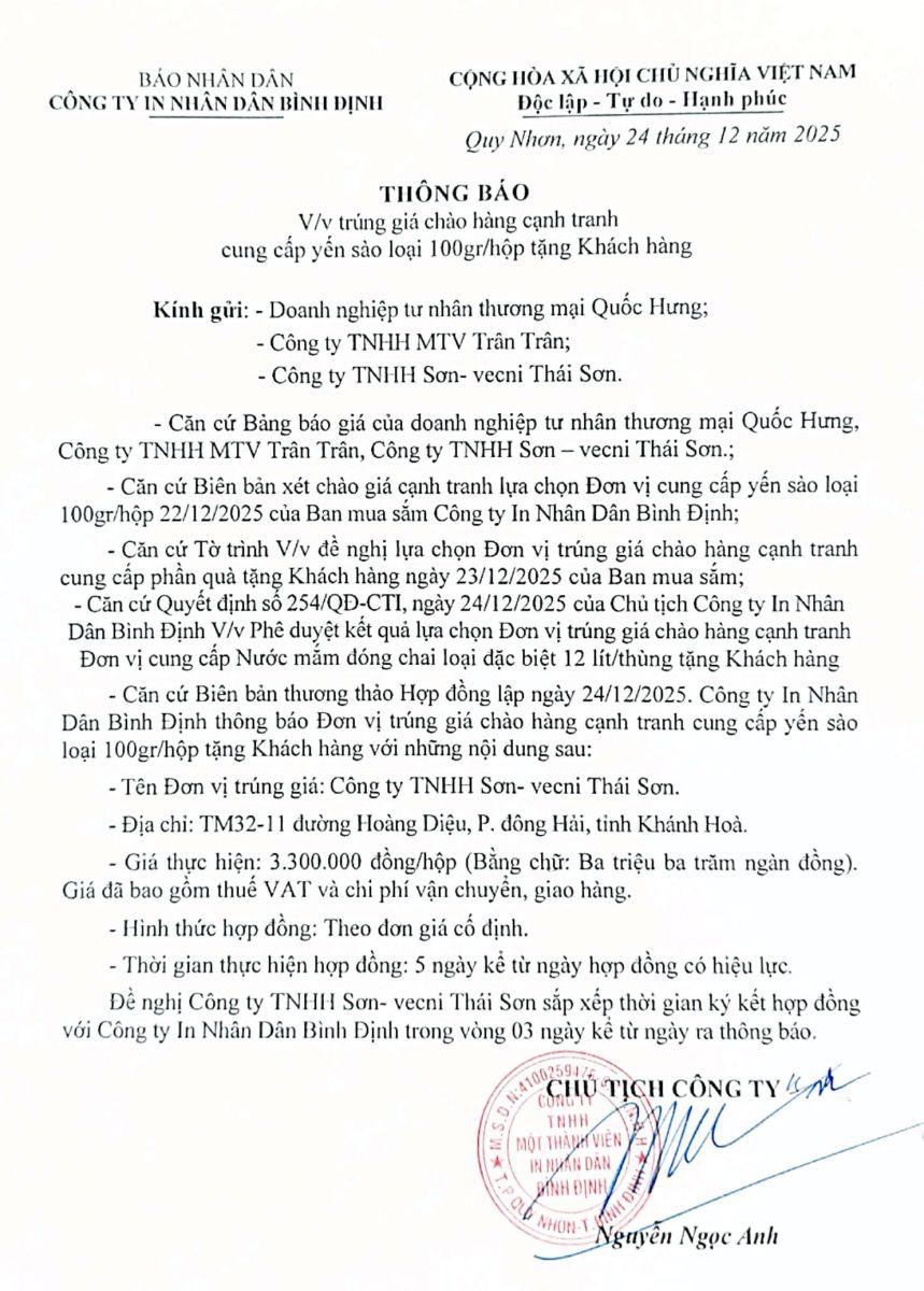 Thông báo V/v trúng giá chào hàng cạnh tranh cung cấp yến sào loại 100gr/hộp tặng khách hàng ngày 20/12/2025