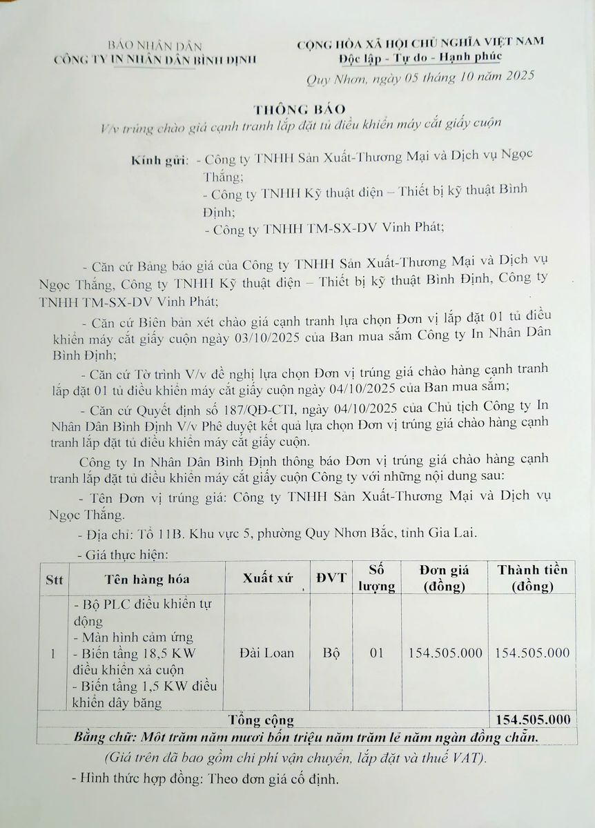 Thông báo V/v trúng giá chào hàng cạnh tranh lắp đặt tủ điều khiển máy cắt giấy cuộn ngày 05/10/2025
