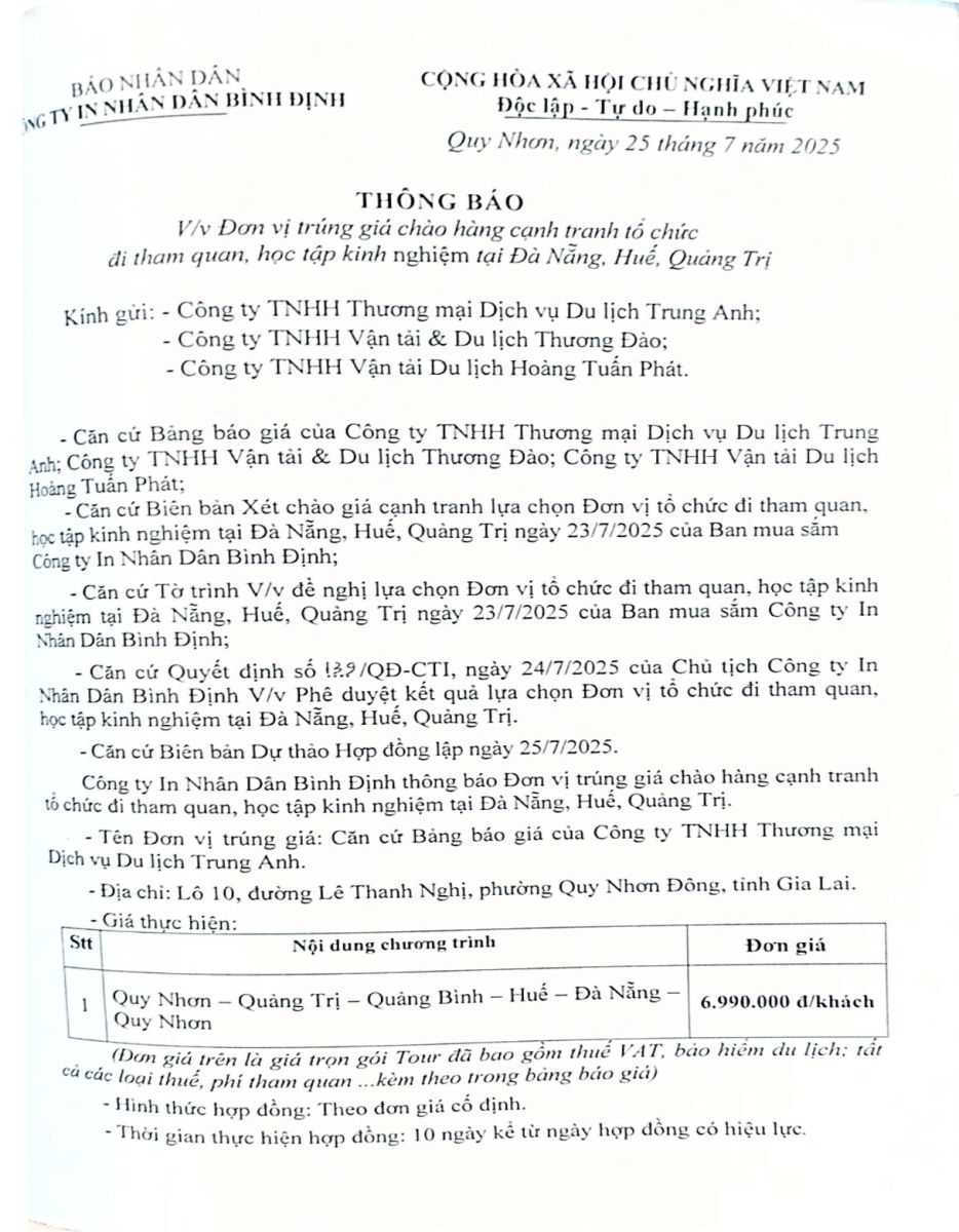 Thông báo V/v trúng giá chào hàng cạnh tranh tổ chức đi tham quan, học tập kinh nghiệm tại Đà nẵng, Huế, Quảng Trị ngày 25/7/2025
