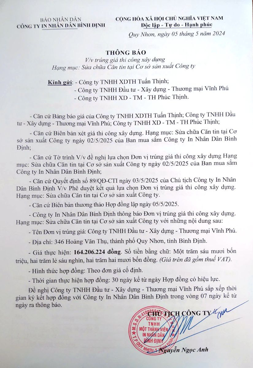 Thông báo V/v trúng giá thi công xây dựng hạng mục sửa chữa căn tin tại cơ sở sản xuất Công ty ngày 05/05/2024
