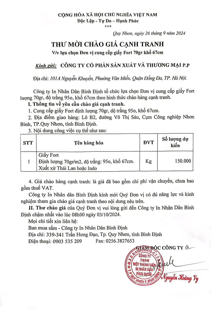 Thư mời chào giá cạnh tranh: V/v lựa chọn đơn vị cung cấp giấy Fort định lượng 70gr/m2 khổ 67cm