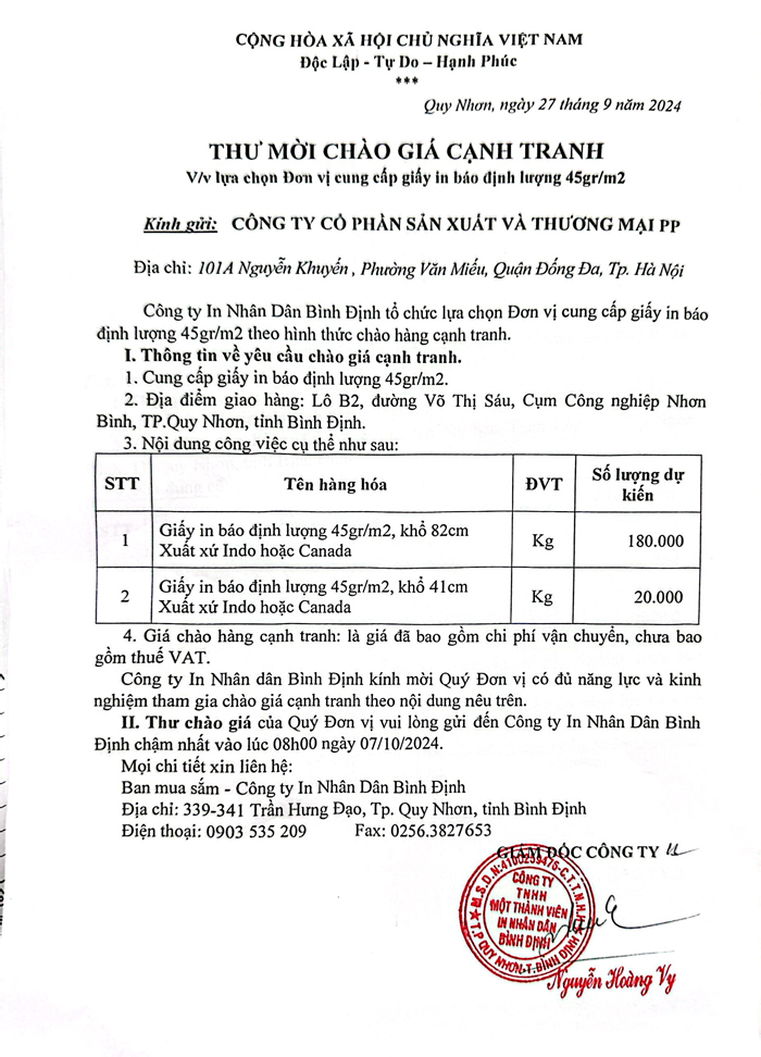 Thư mời chào giá cạnh tranh: V/v lựa chọn đơn vị cung cấp giấy in báo định lượng 45gr/m2
