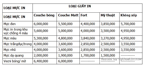 Thí dụ: Bài in màu đen trên giấy Fort theo bảng tra cứu sẽ có độ phủ mực là 4,400,000 tức là 1 kg mực đen khi in trên giấy Fort sẽ cho độ phủ mực tông nguyên trên 4,400,000 cm2
